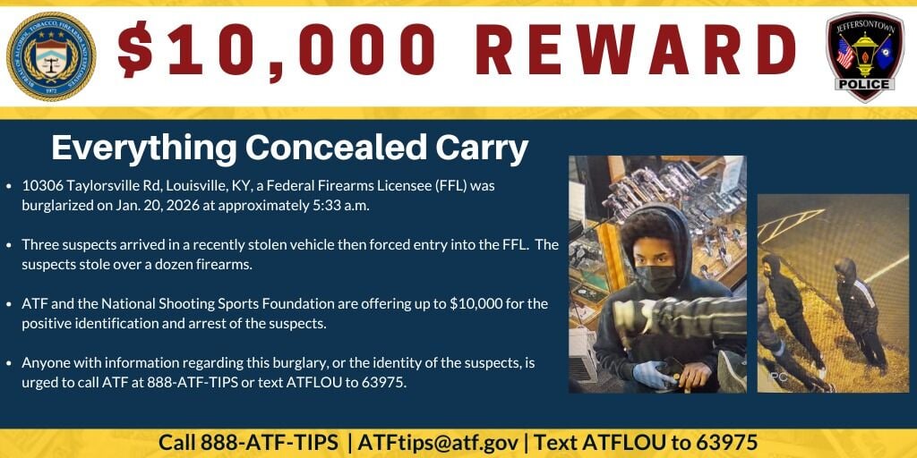 According to a news release, on Jan. 20, just after 5:30 a.m., three suspects broke into Everything Concealed Carry (ECC), which is a Federal Firearms Licensee (FFL), located at 10306 Taylorsville Road in Louisville.