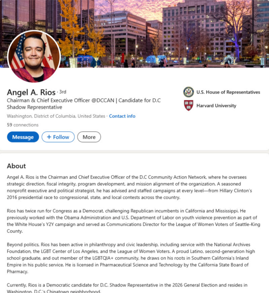 He has social media posts mentioning he is a candidate for DC’s Shadow Representative opening.