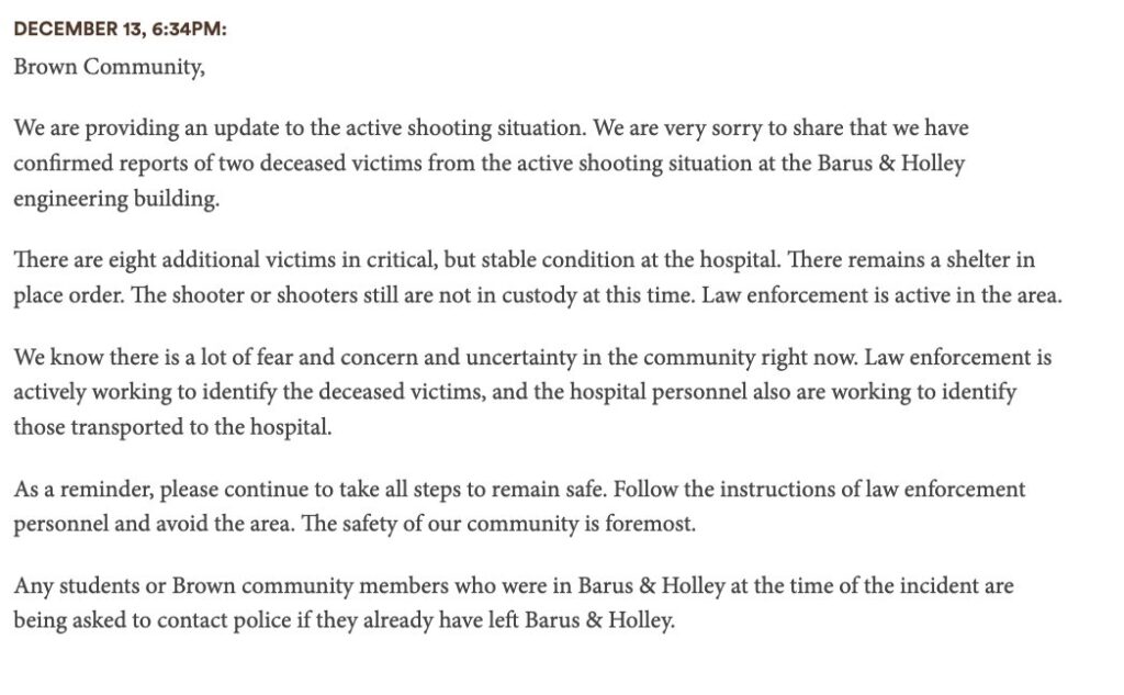 Brown University: We are providing an update to the active shooting situation. We are very sorry to share that we have confirmed reports of two deceased victims from the active shooting situation at the Barus & Holley engineering building.